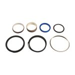 Set of sealing rings made of various materials containing a rubber sealing ring, a plastic stop ring and a scraper ring used to repair the hydraulic cylinder of a construction machine.
