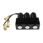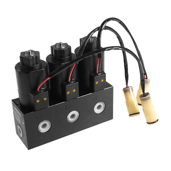 Directional control valve block for 3-way, 2-position oil-hydraulic transmission combined in one body, operated by solenoid with spring return for use on soil excavators.